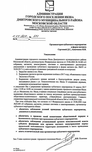 Ниже приводится текст официального разрешения на проведение митинга от администрации городского поселения Икша: